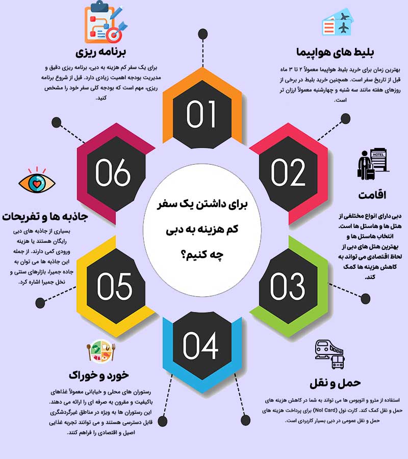 دبی، شهر لوکس و مدرن امارات متحده عربی، مقصدی است که در ذهن بسیاری از مسافران به عنوان یک تجربه گران قیمت و پرهزینه تلقی می شود. اما با برنامه ریزی دقیق و رعایت نکات کلیدی، می توان به دبی سفر کرد و از جاذبه های آن بهره برداری کرد بدون اینکه هزینه های زیادی را متحمل شد. ما در این مقاله به بررسی روش های مختلف برای داشتن یک سفر کم هزینه به دبی از جمله اقامت، حمل و نقل، غذا، جاذبه ها و نکات کاربردی برای کاهش هزینه ها می پردازد. پس اگر شما هم در فکر داشتن چنین سفری هستید تا انتها با ما همراه باشید تا راهکار های کاهش هزینه سفر به دبی را کشف کنیم.
